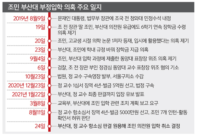 판결이 내려지기 까지 부산대는 조민 입학취소에 대해 보류하겠다는 의견을 냈습니다. 하지만 교육부는 부산대에 조민 입학 취소와 관련된 조치 계획을 보고하도록 요구했으며, 결국 8월 24일 조민의 의전원 입학 취소를 결정한 것입니다.